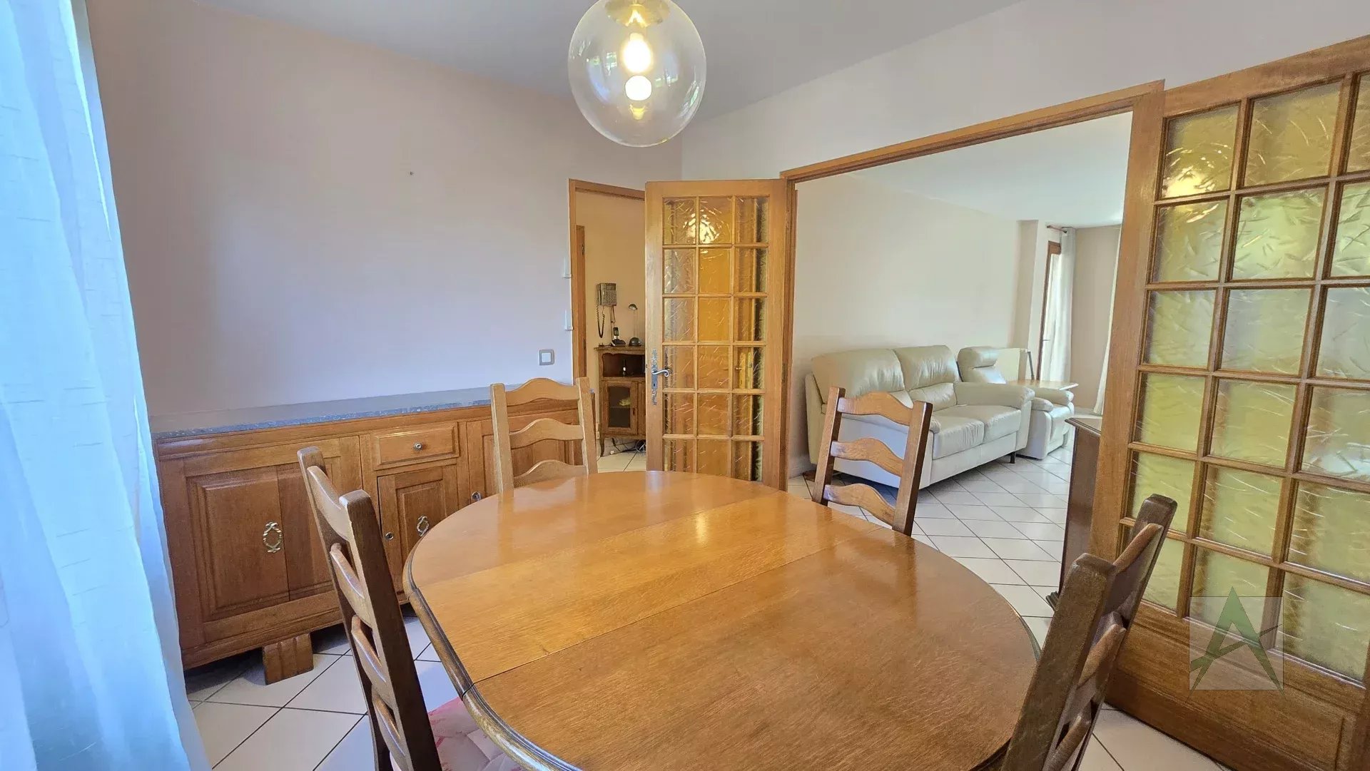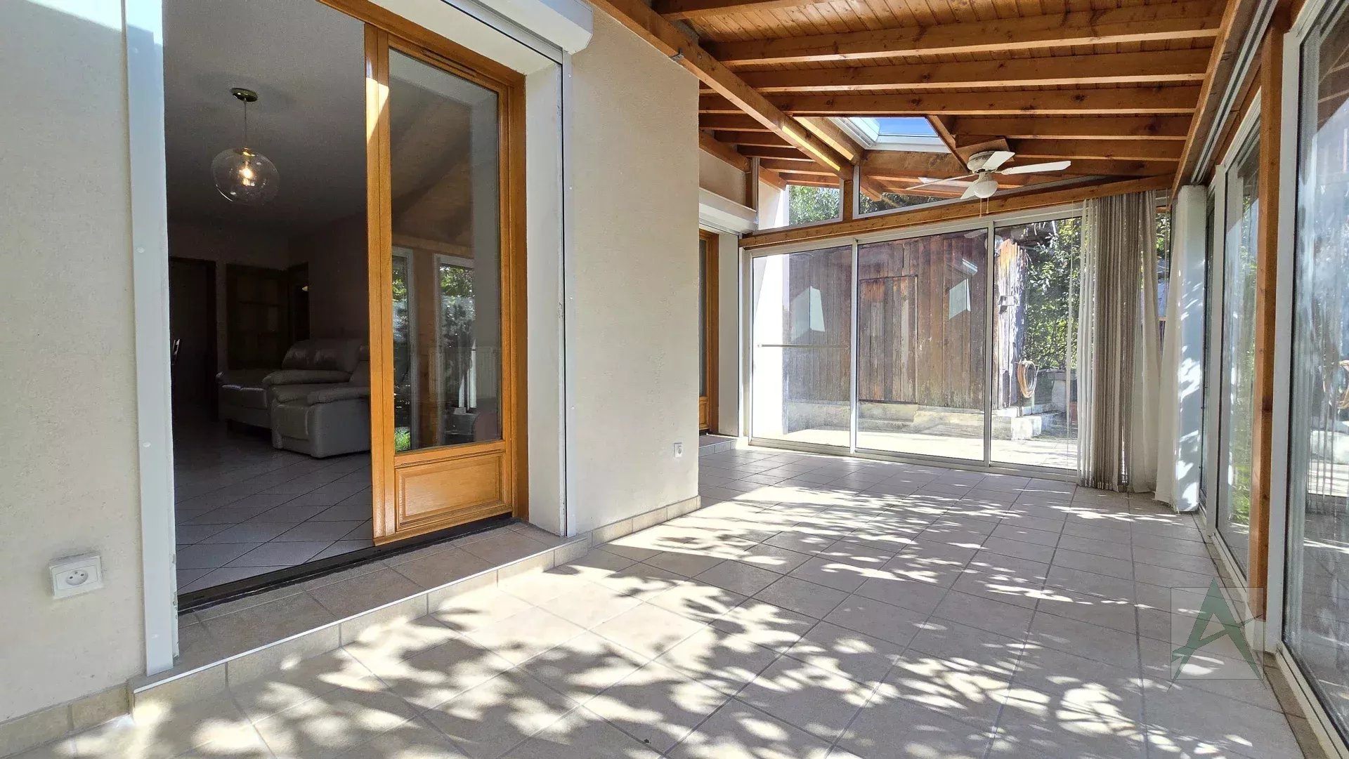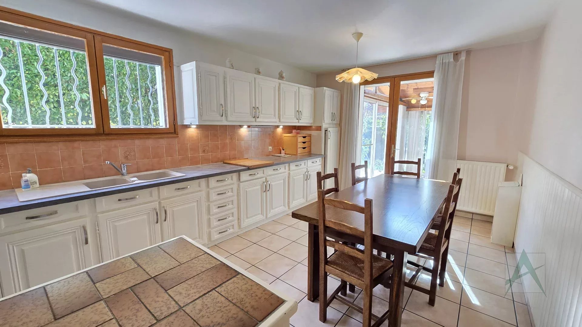 Maison de 103m² plus veranda de 18m², le tout sur parcelle de 521m² avec une exposition SUD, comprenant salle à manger-salon et cuisine intégrée avec véranda et accès direct sur le jardin, salle de douches/toilettes.
