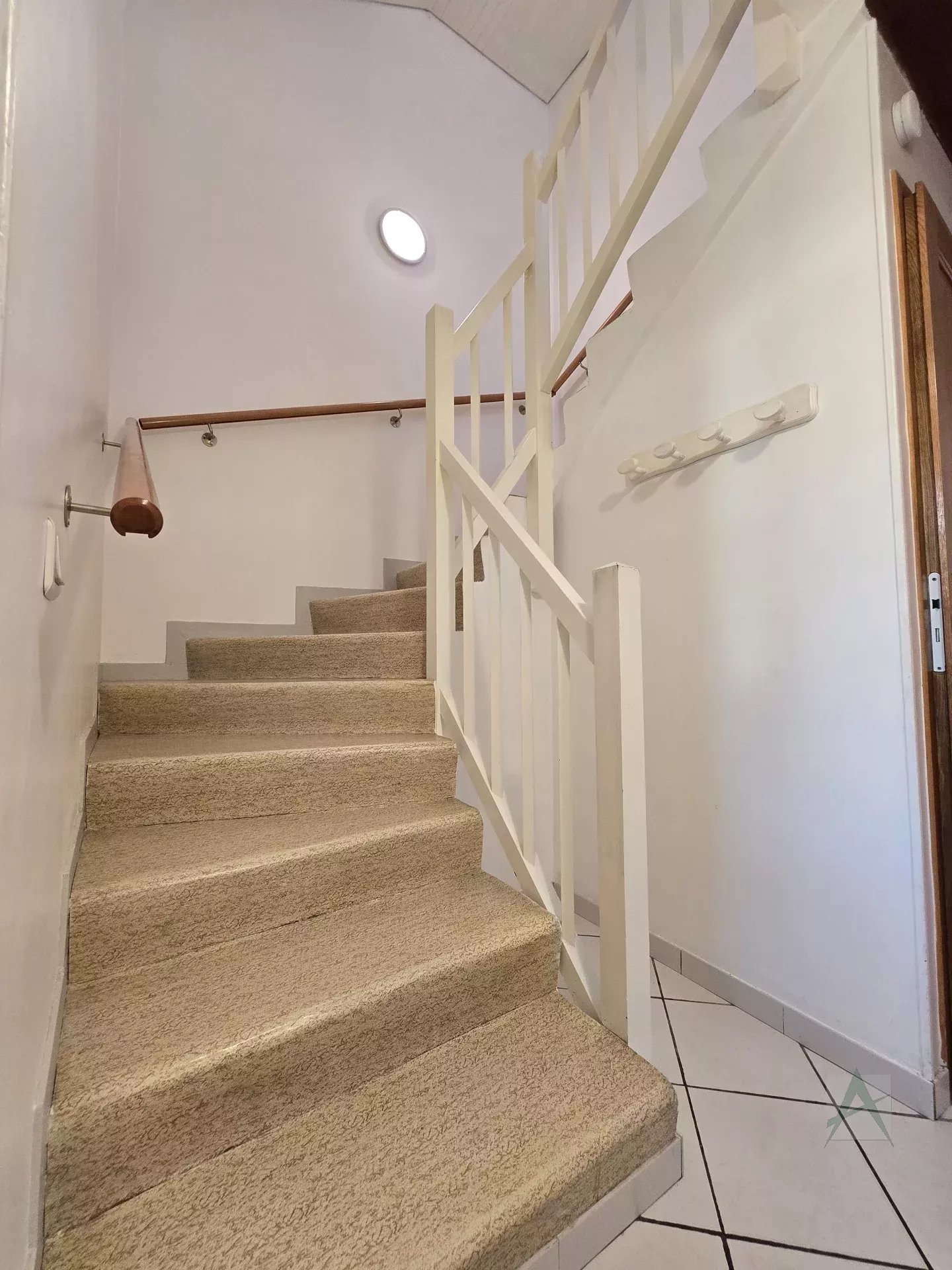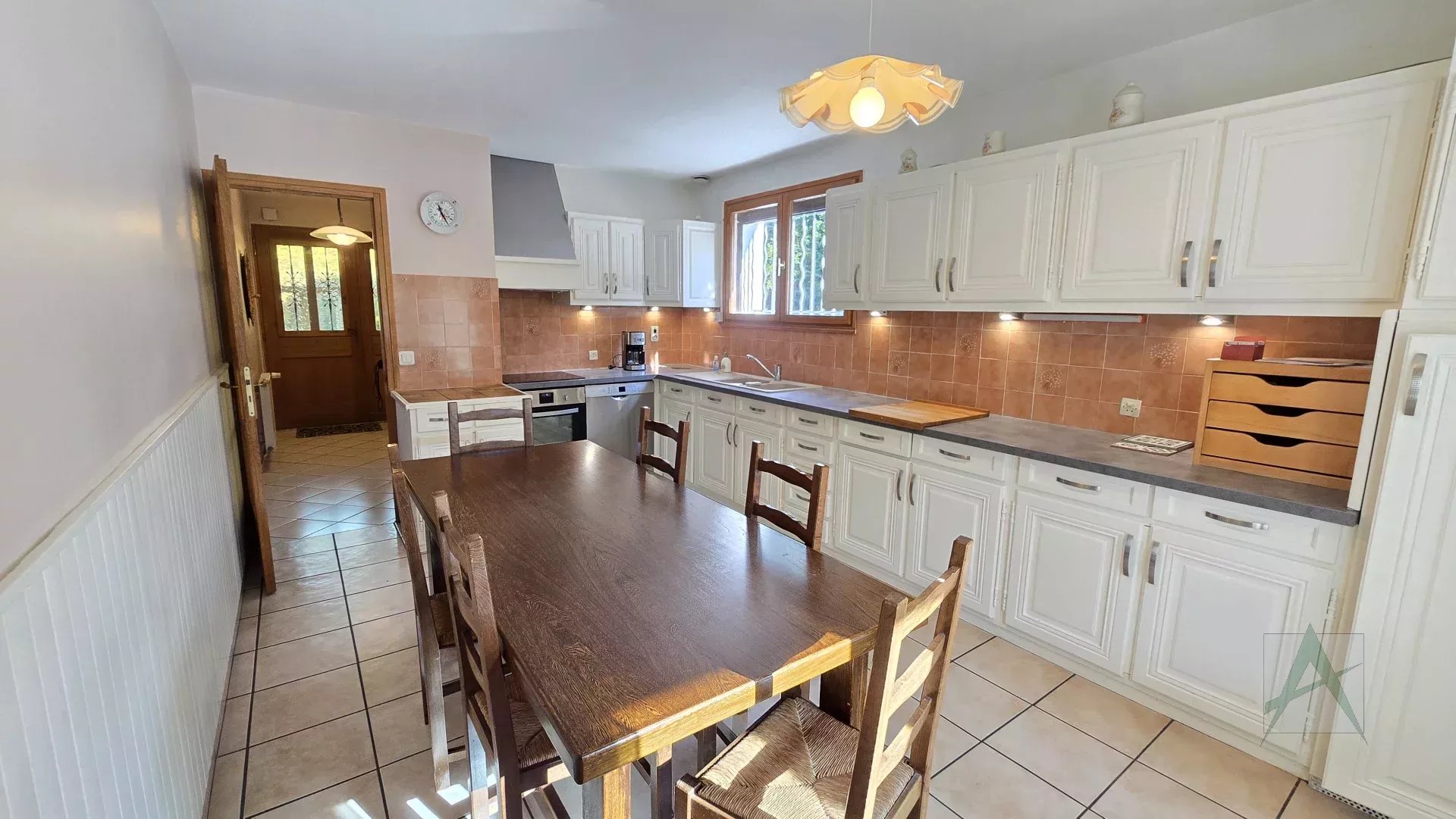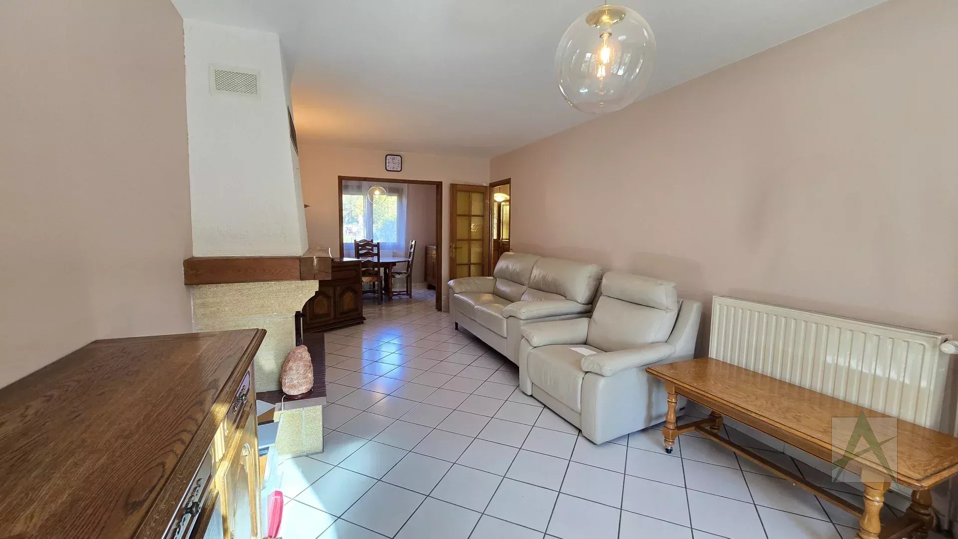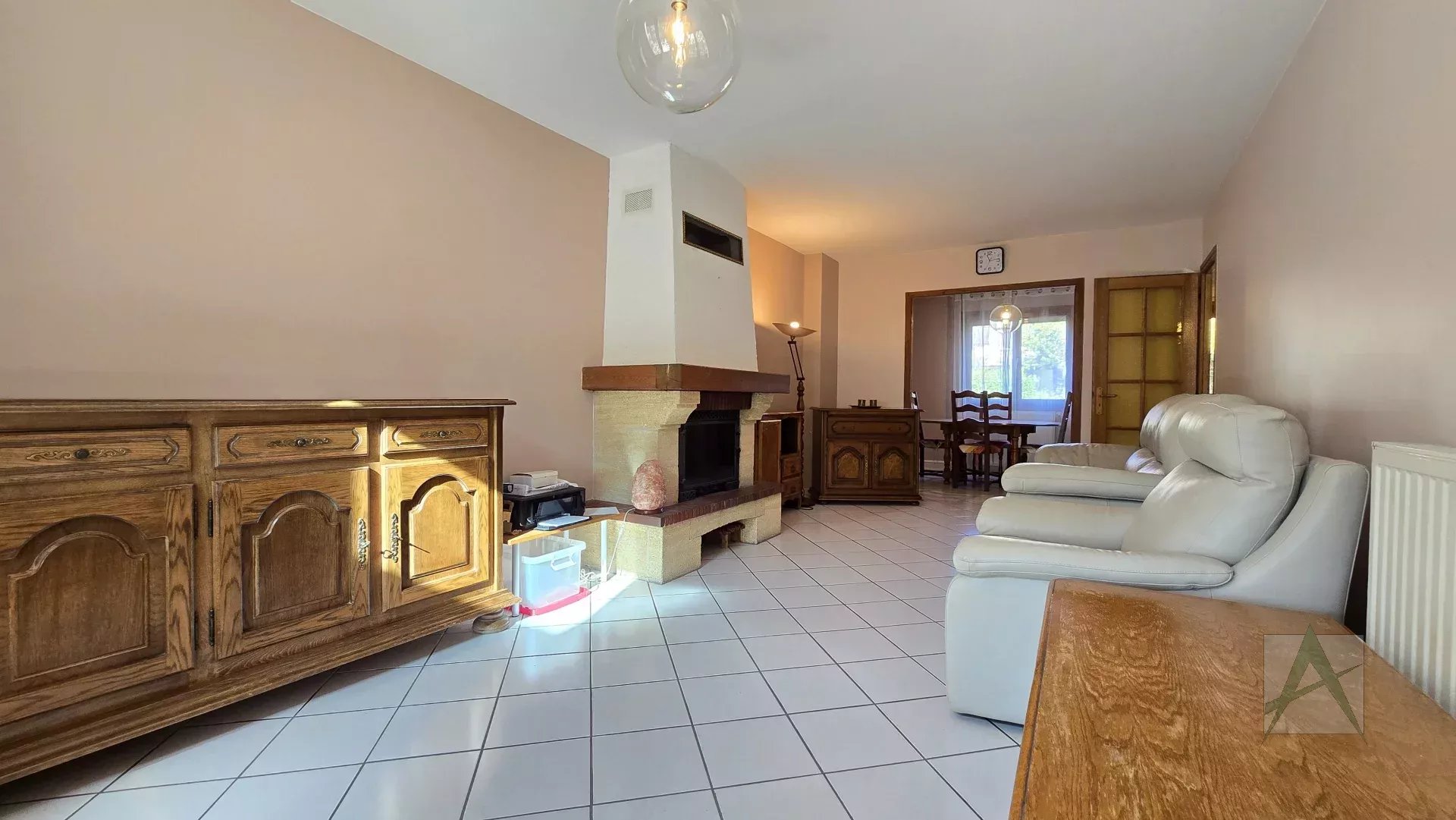 Maison de 103m² plus veranda de 18m², le tout sur parcelle de 521m² avec une exposition SUD, comprenant salle à manger-salon et cuisine intégrée avec véranda et accès direct sur le jardin, salle de douches/toilettes.